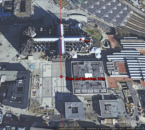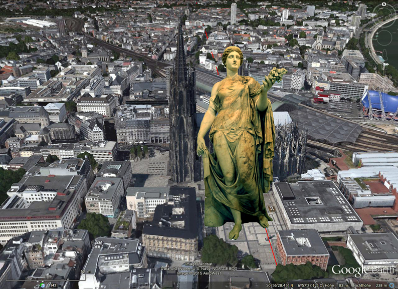 Die Blumengöttin Flora erreicht in ihrer Wirklichkeit den Koloss des Kölner Doms in Scheitelhöhe und sät die Blumen über den Meridian, über die Stadt und den Erdkreis. In diesem virtuellen Projekt wird die Göttin vor Ort zur virtuellen Realität! Hierzu wird die Flora Maggiore aus dem archäologischen Nationalmuseum Neapel zu einer " jpg - Blumengöttin" in realer Höhe des Kölner Doms von 153,38 Metern im Netz erzeugt. Sie ist mit nur einem Pixel pro Inch zwar sehr dünnhäutig, bleibt aber in ihrer kolossalen Bildhaftigkeit im Netz abrufbar. |