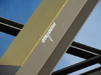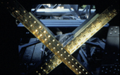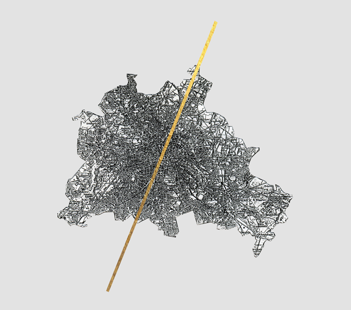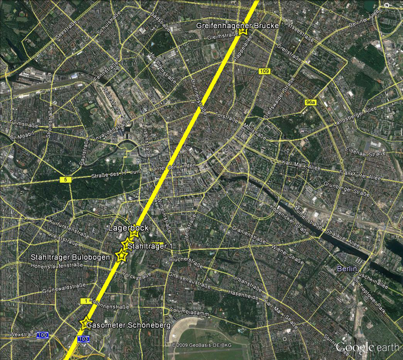 stadtrauminstallation goldener schnitt durch berlin - 1988 zogen wir über das geteilte Berlin eine ästhetische Teilung. Wir zogen einen goldenen Schnitt durch Gesamtberlin, indem wir auf einer exakten Linie Stahlbauelemente an fünf Profanbauten vergoldeten. | ||||||||||||||||||